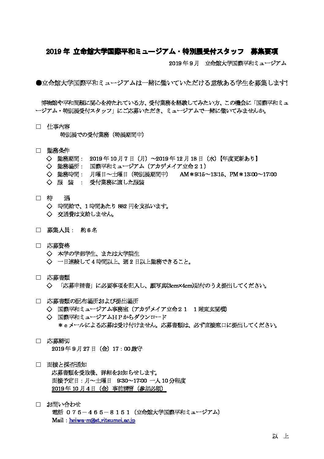 特別展受付スタッフ募集要項・応募書