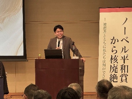 基調講演では、日本被団協代表理事の金本弘氏が登壇し、自身の被爆体験や、父親に命を救われたことを姉の手記で知ったエピソードを紹介。「世界はまだ私たちの運動を十分に知らない。日本が核兵器禁止条約に参加し、核廃絶を実現するためにどうすればよいか、一緒に考えてほしい」と呼びかけました。また、「せめて生きている間に、核兵器廃絶の道筋を知って死にたい」という切実な思いを語りました。