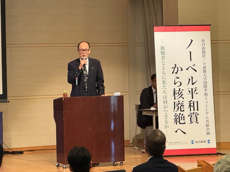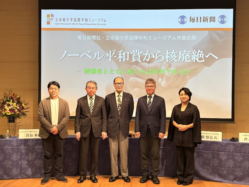 毎日新聞社と立命館大学国際平和ミュージアムの共催によるシンポジウム「ノーベル平和賞から核廃絶へ─被爆者とともに私たちは何ができるかー」を開催しました。当日は、核兵器廃絶に関心を寄せる市民や学生など約60名が参加し、熱心な議論が交わされました。